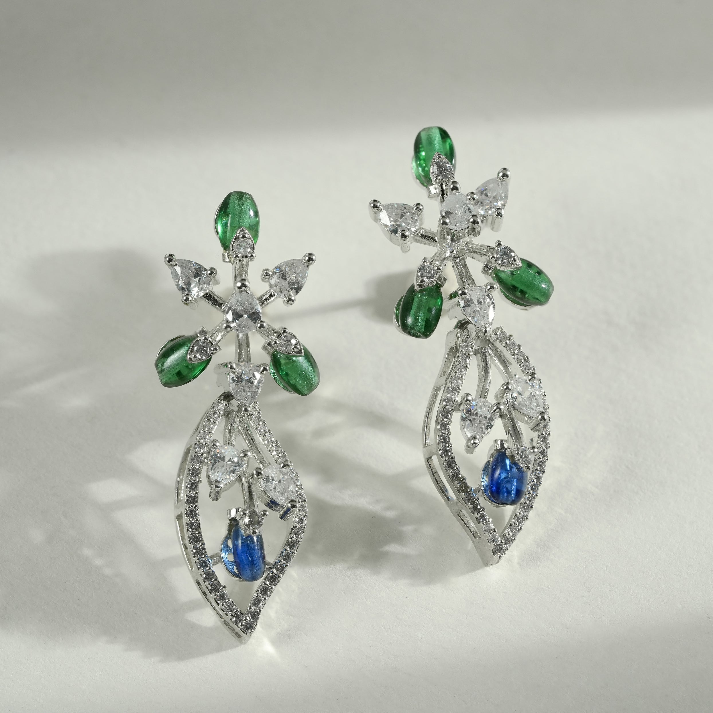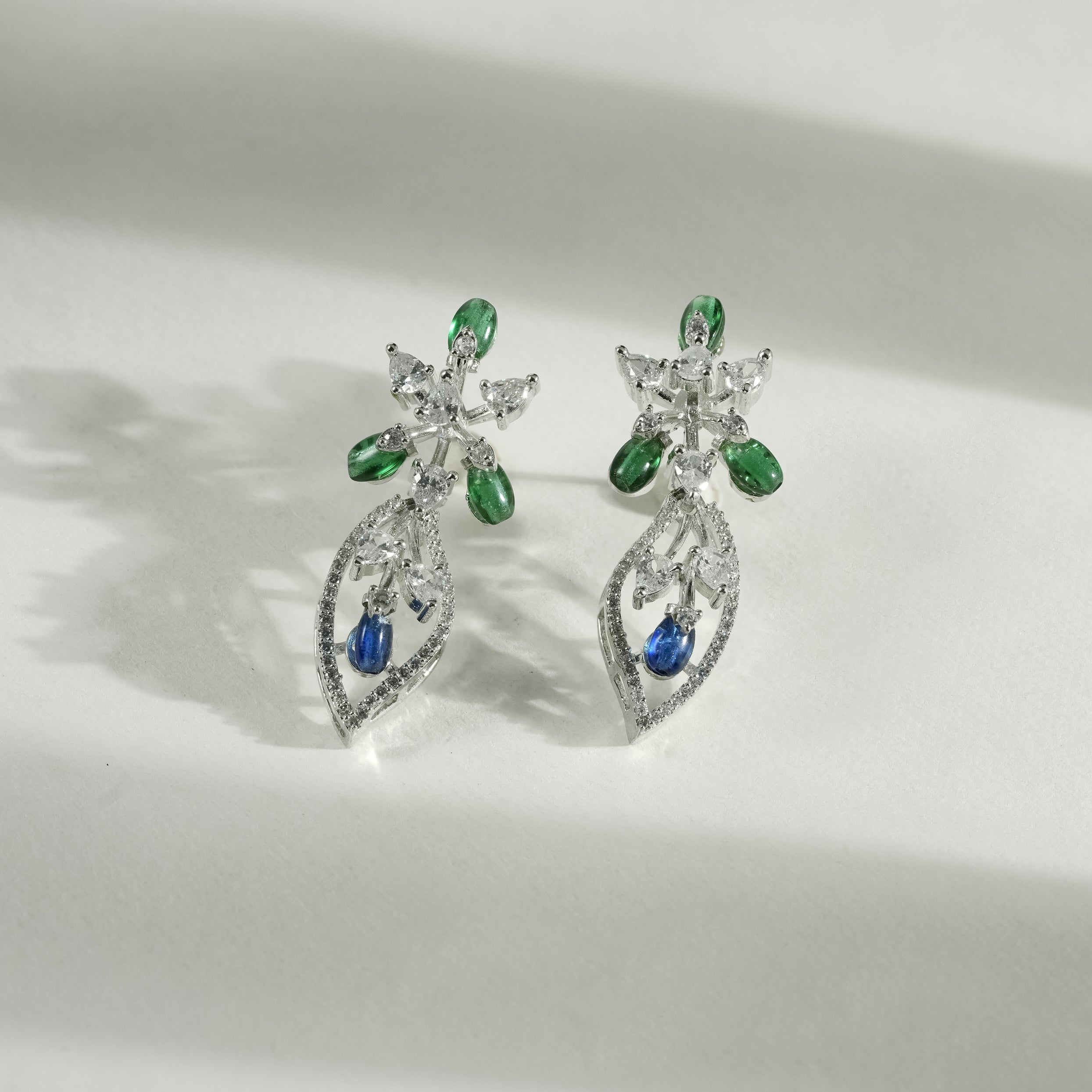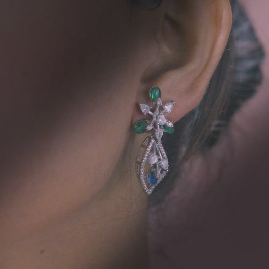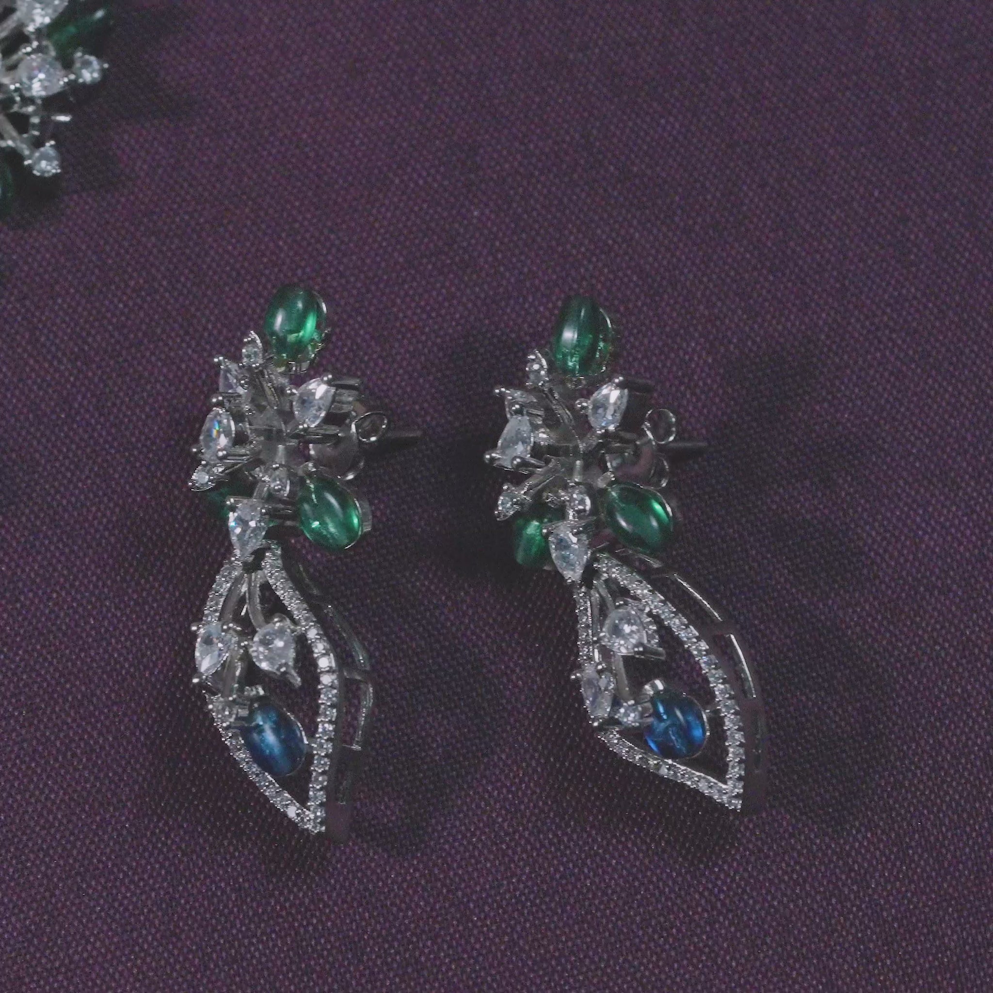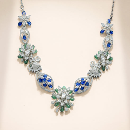 This coordinated necklace and earring set features a flowing floral composition crafted in sterling silver. The design unfolds through layered botanical motifs, accented with deep blue and fresh green cubic zirconia that bring contrast and visual depth. Clear cubic zirconia highlights frame each element, adding structured brilliance without overpowering the form.