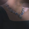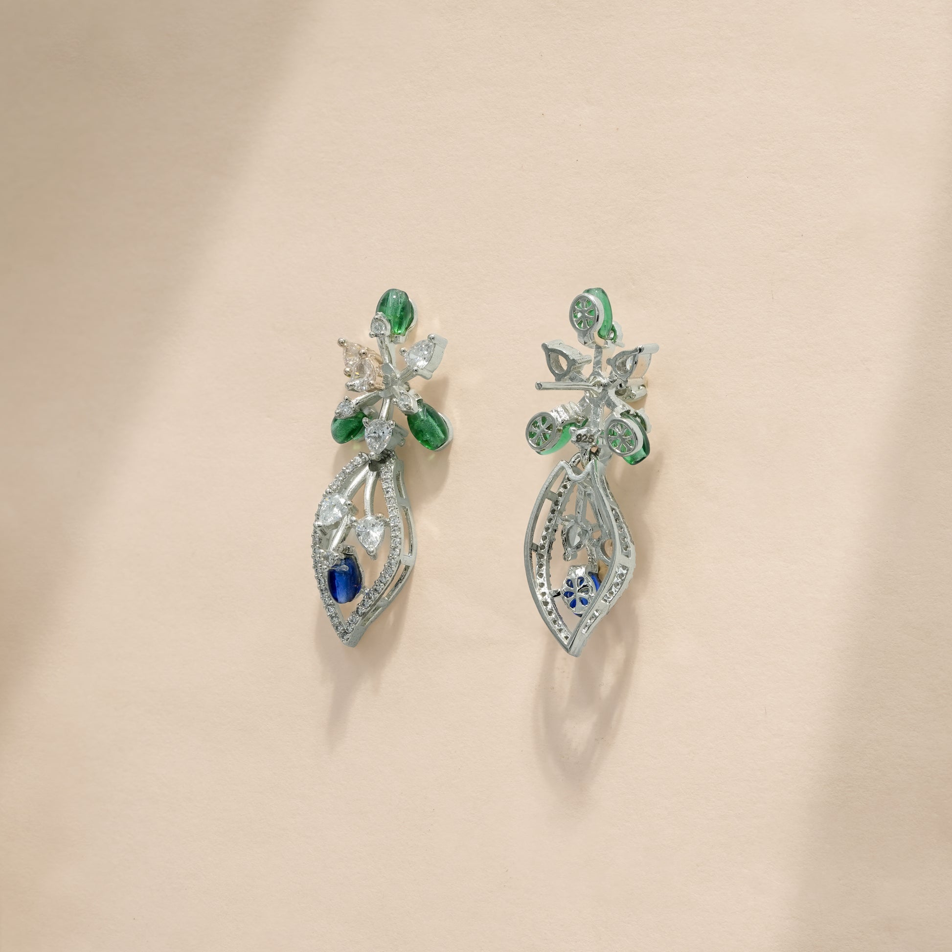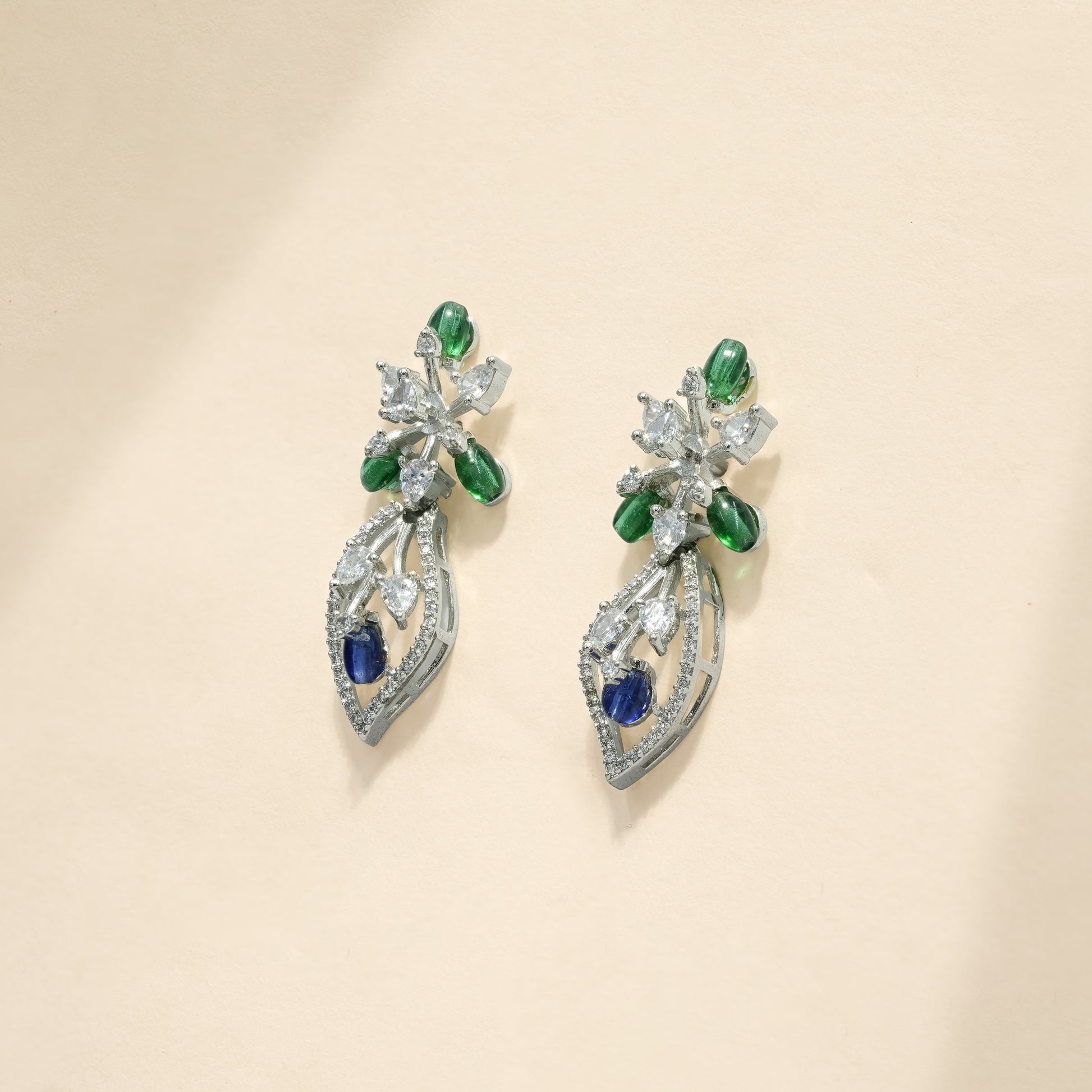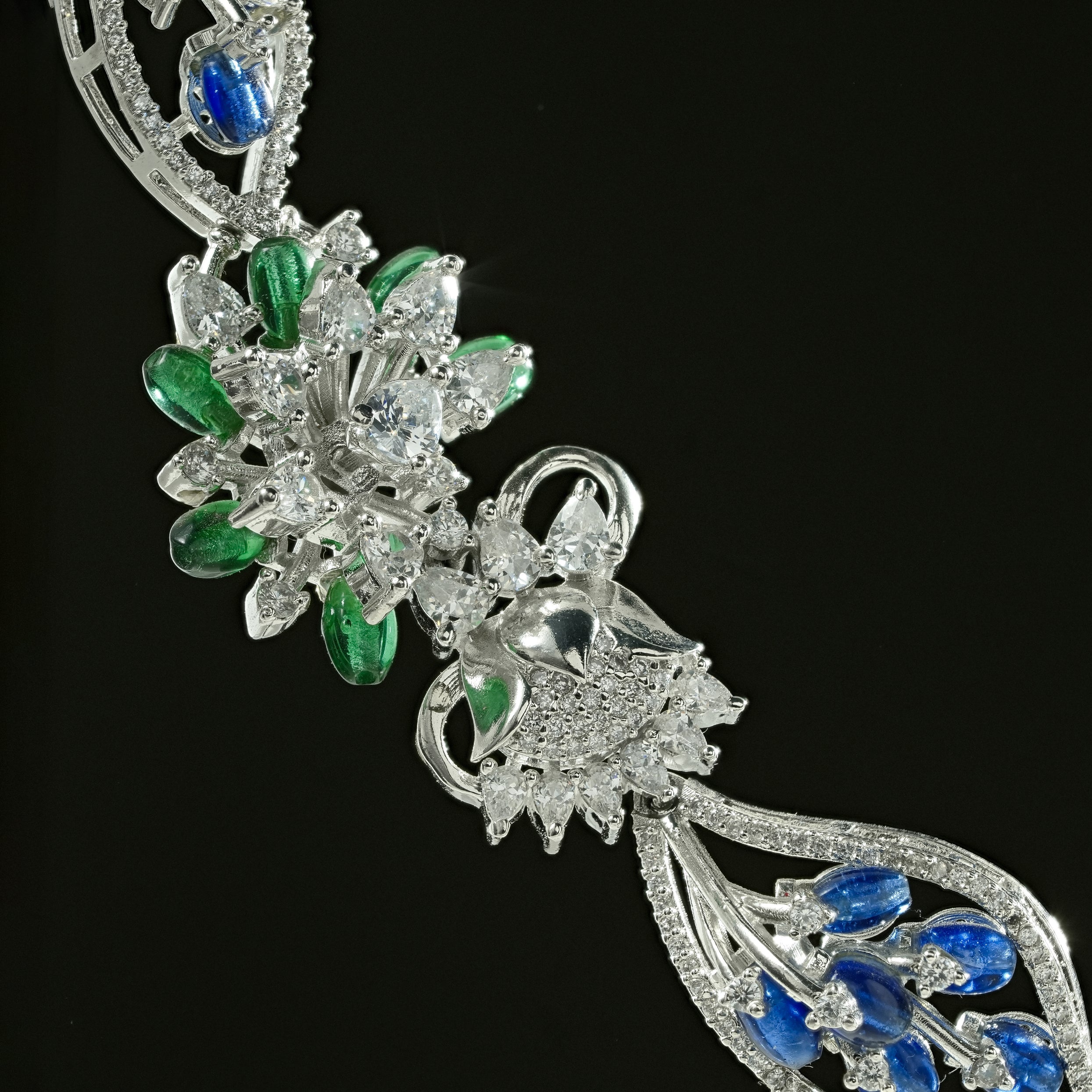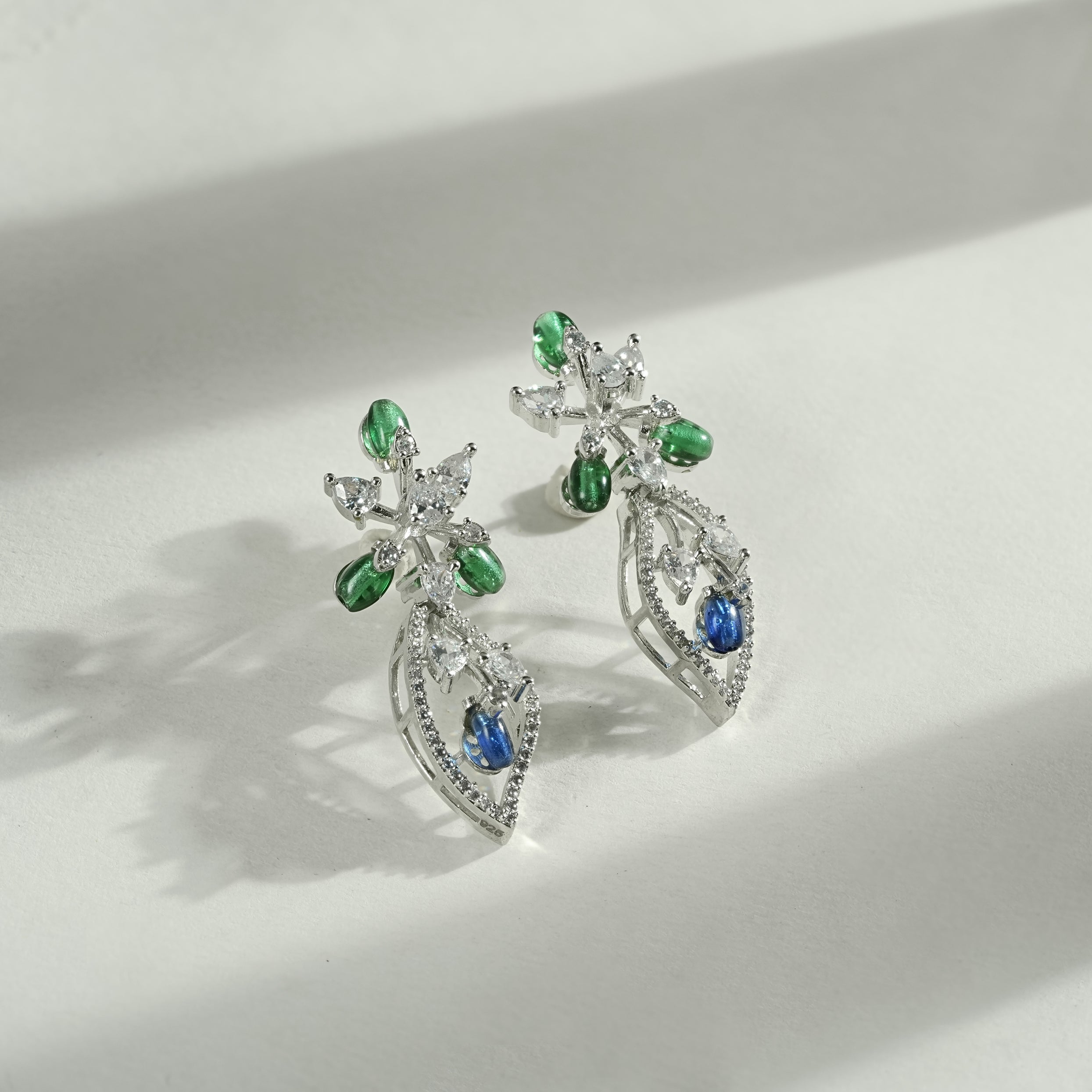 This coordinated necklace and earring set features a flowing floral composition crafted in sterling silver. The design unfolds through layered botanical motifs, accented with deep blue and fresh green cubic zirconia that bring contrast and visual depth. Clear cubic zirconia highlights frame each element, adding structured brilliance without overpowering the form.