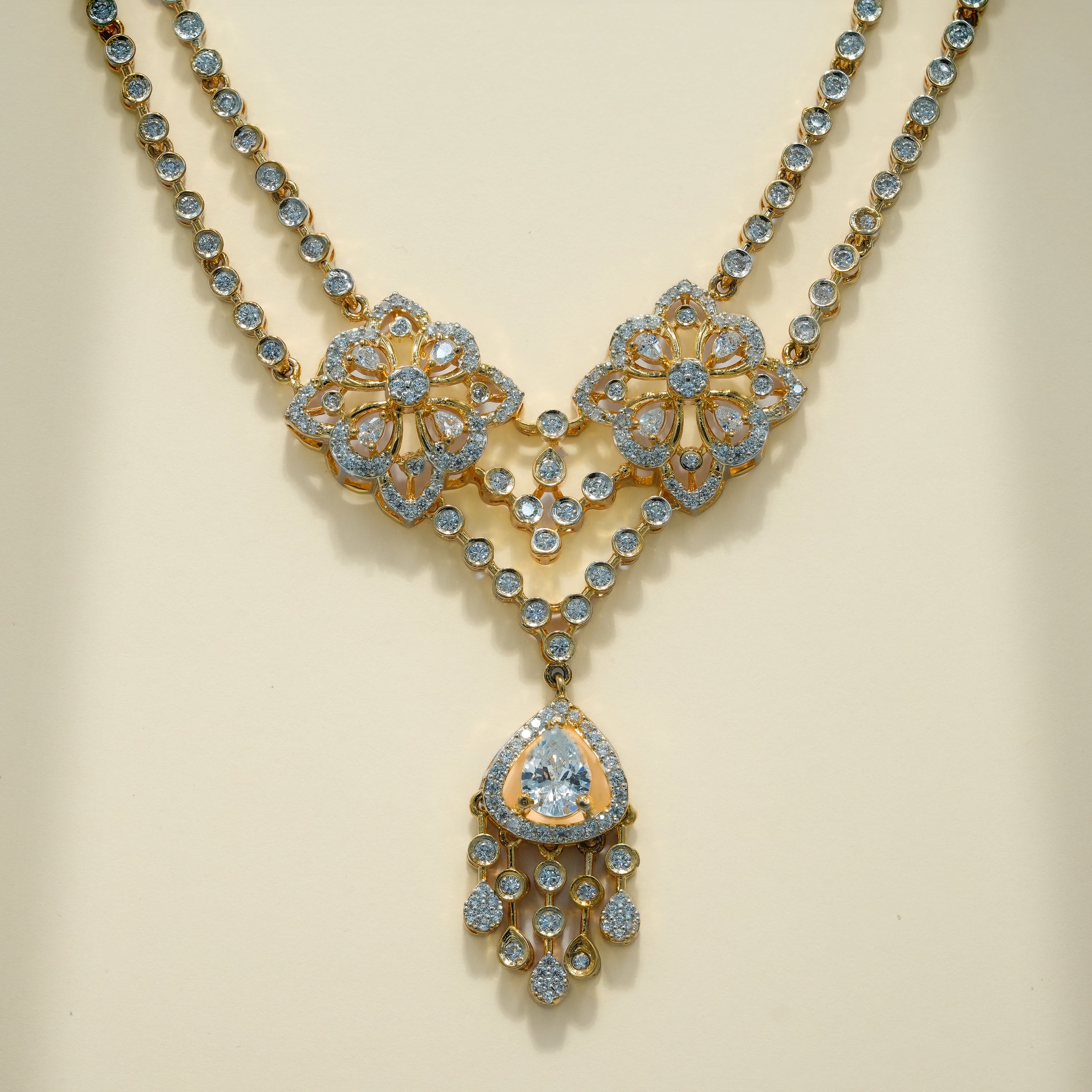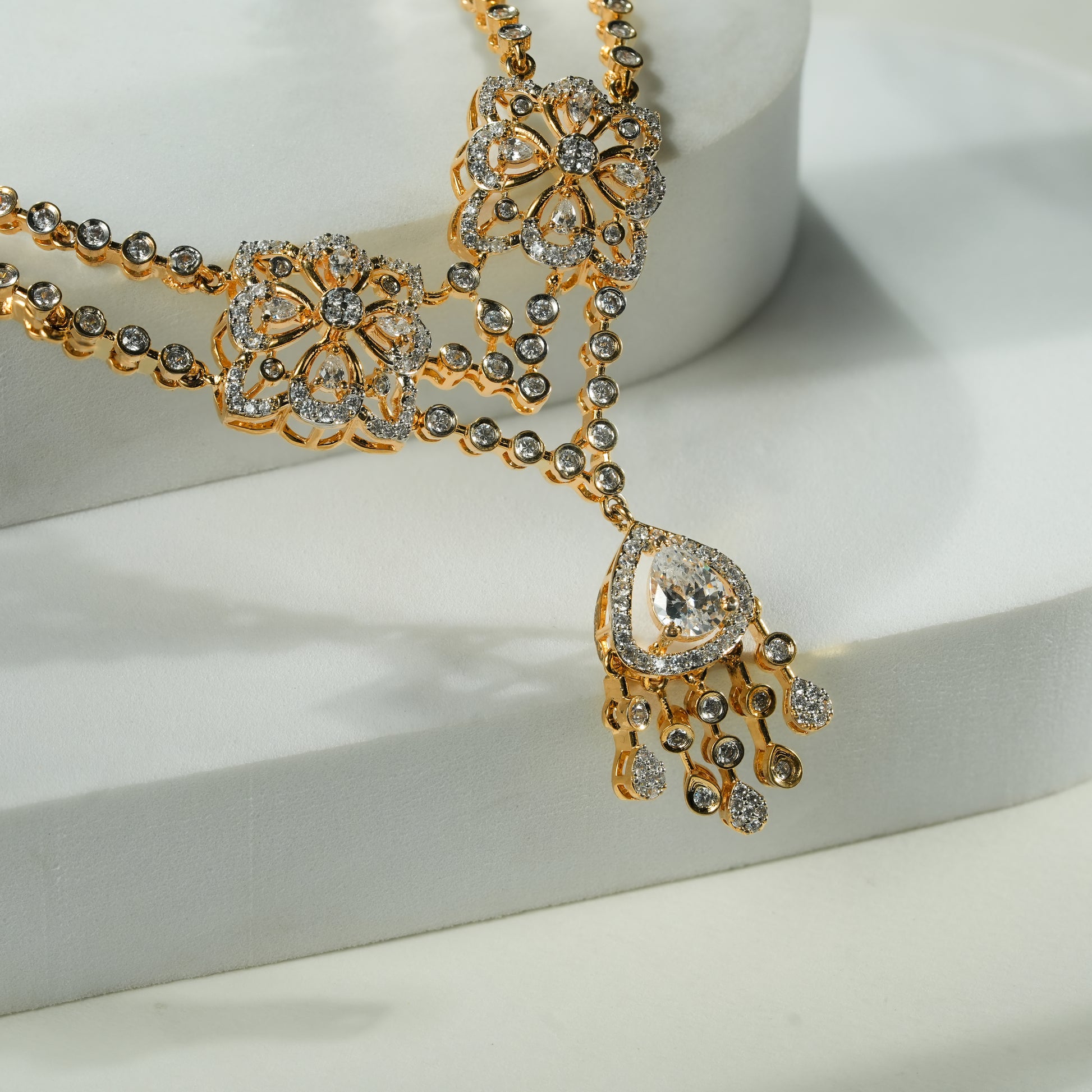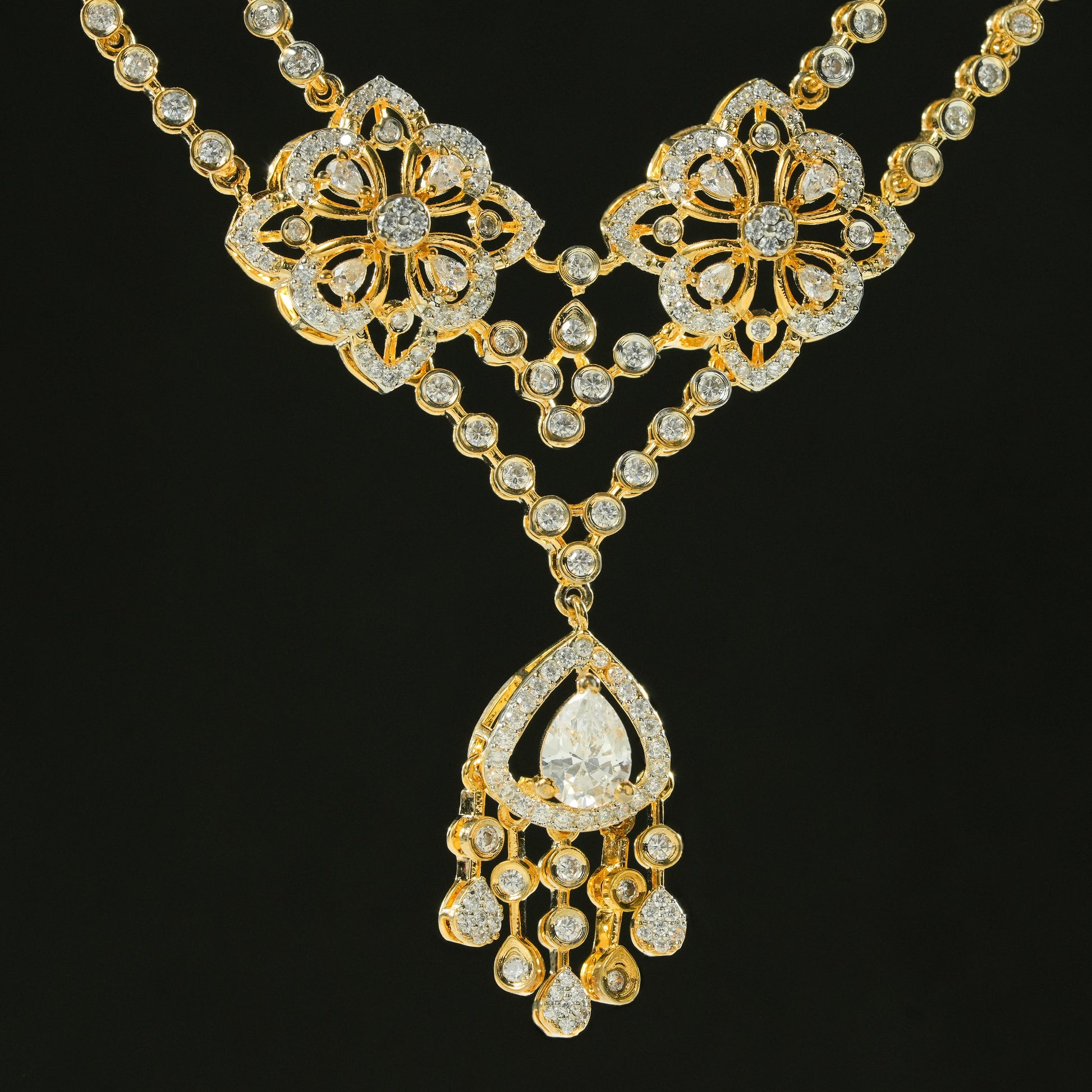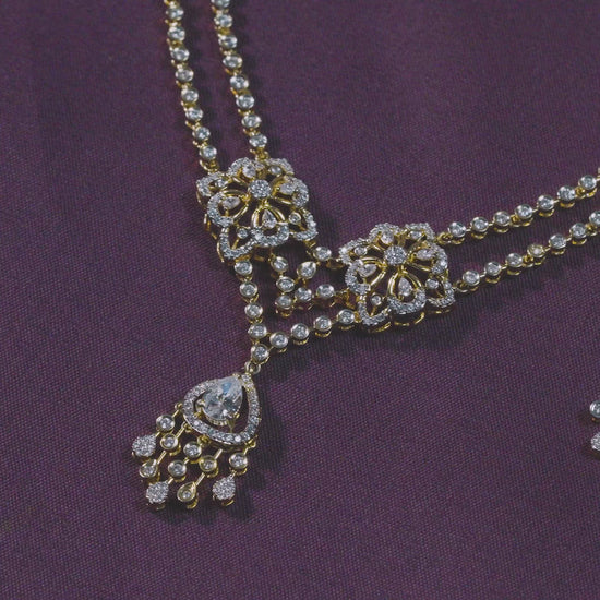 This necklace set is crafted in real 92.5 sterling silver, designed with a strong visual structure and detailed craftsmanship. The dual floral elements form the core of the design, each carefully constructed to create depth, symmetry, and balance. The layout flows seamlessly into a defined drop section, giving the piece a composed yet striking presence.