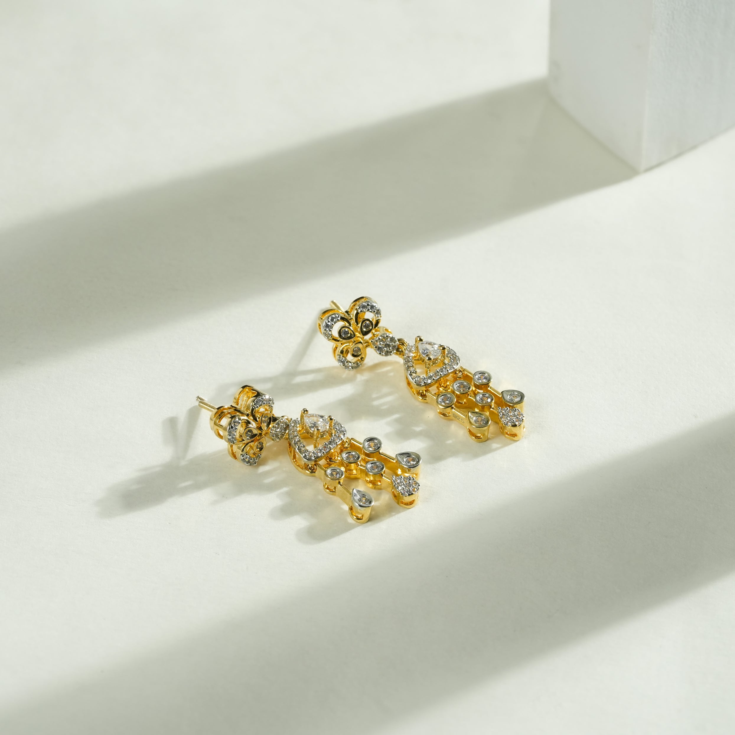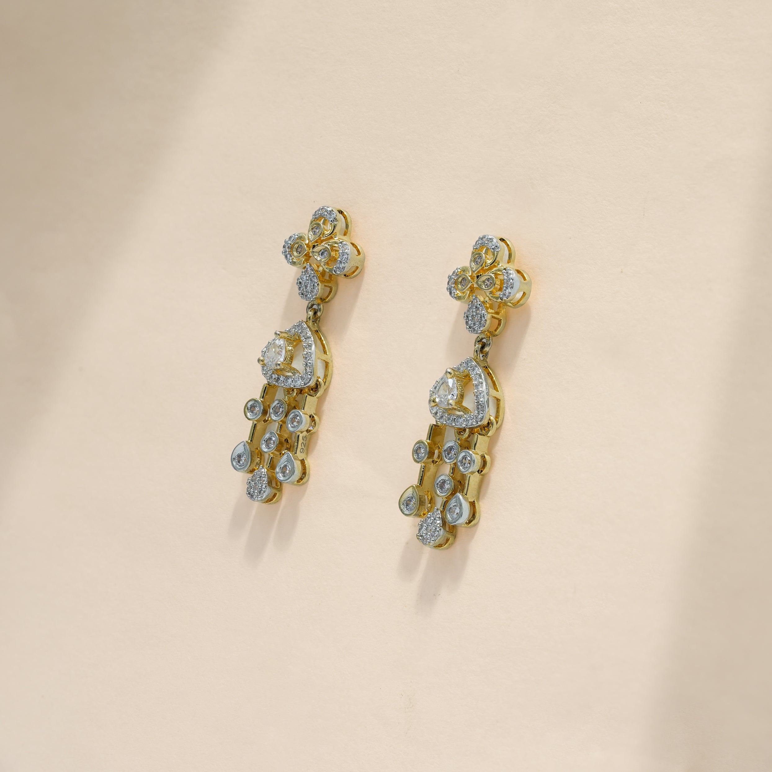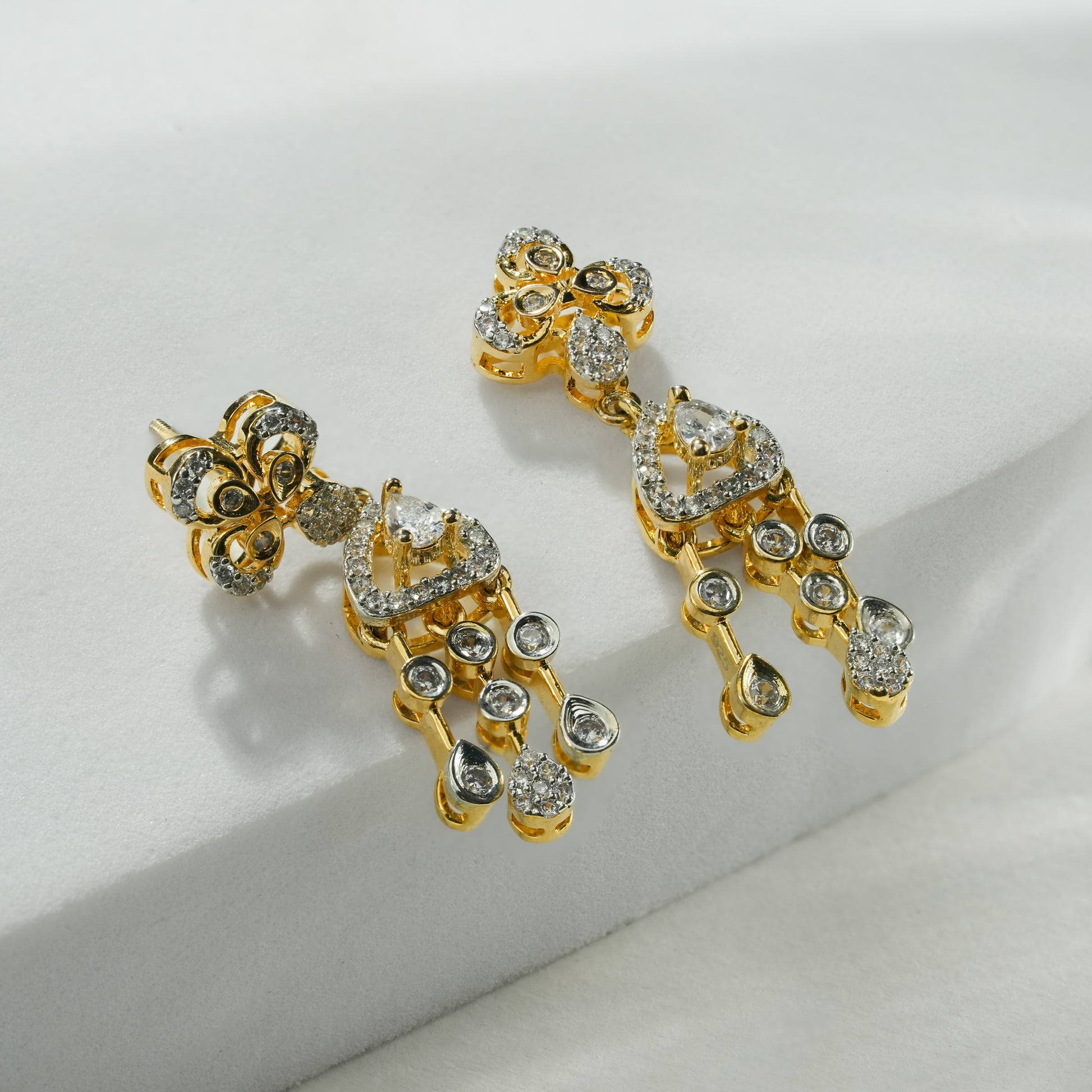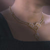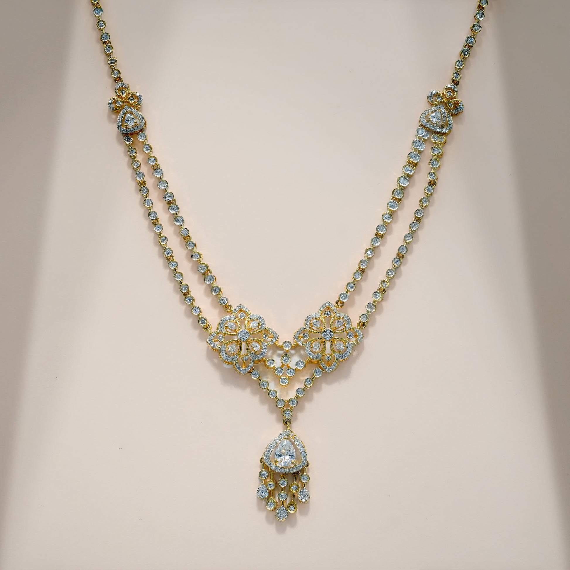 This necklace set is crafted in real 92.5 sterling silver, designed with a strong visual structure and detailed craftsmanship. The dual floral elements form the core of the design, each carefully constructed to create depth, symmetry, and balance. The layout flows seamlessly into a defined drop section, giving the piece a composed yet striking presence.