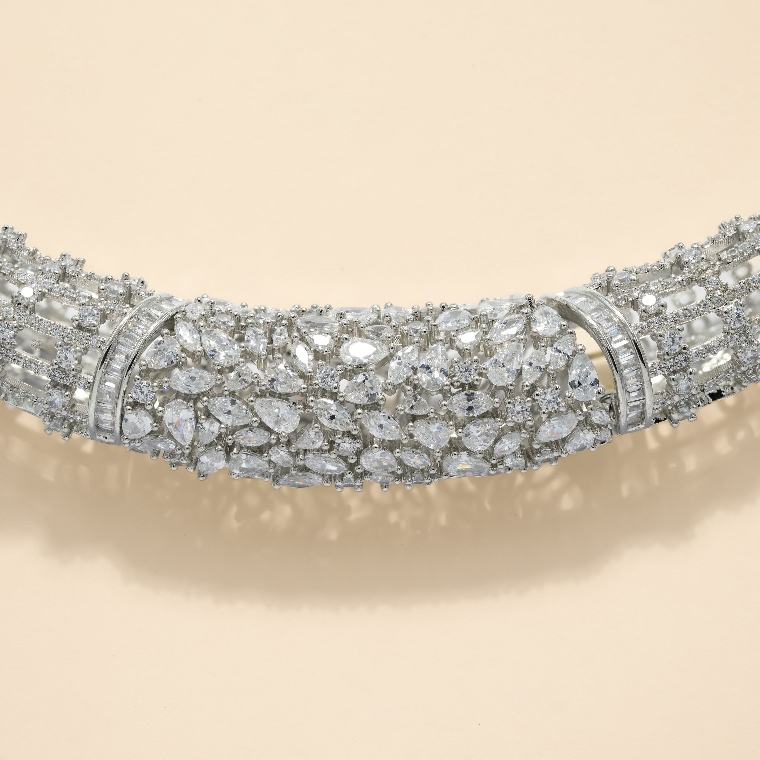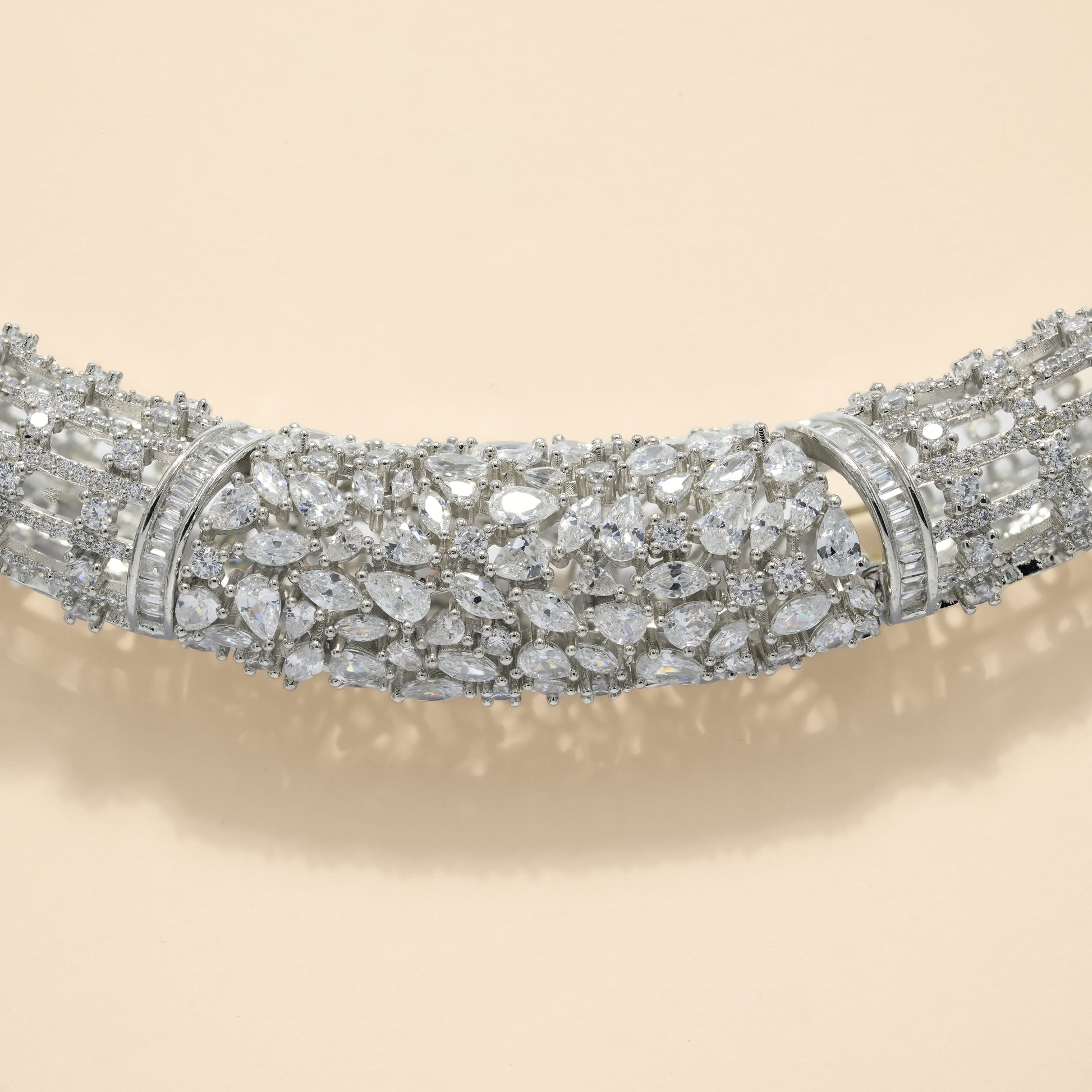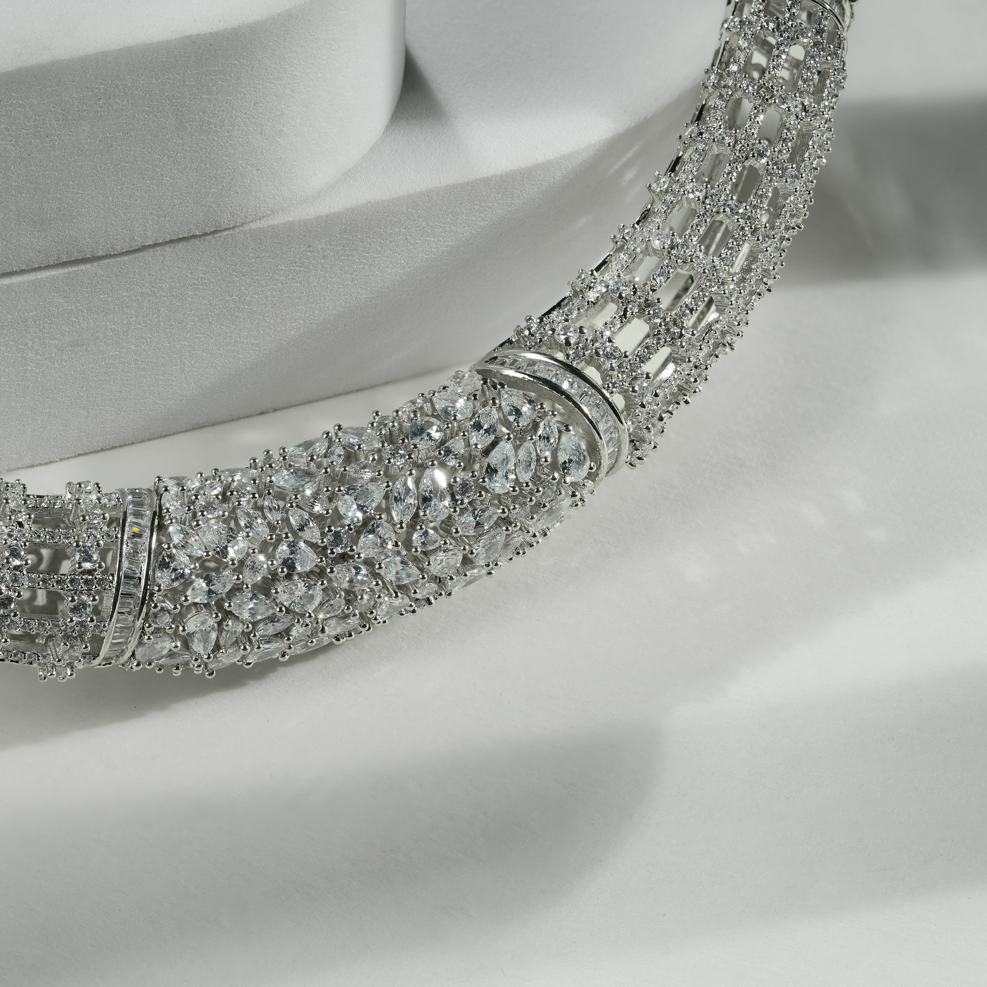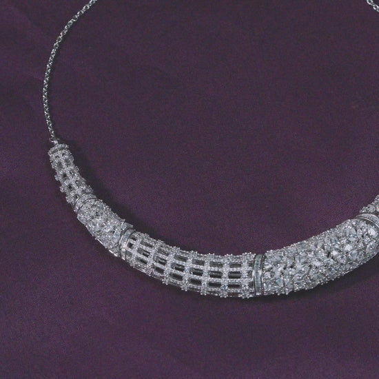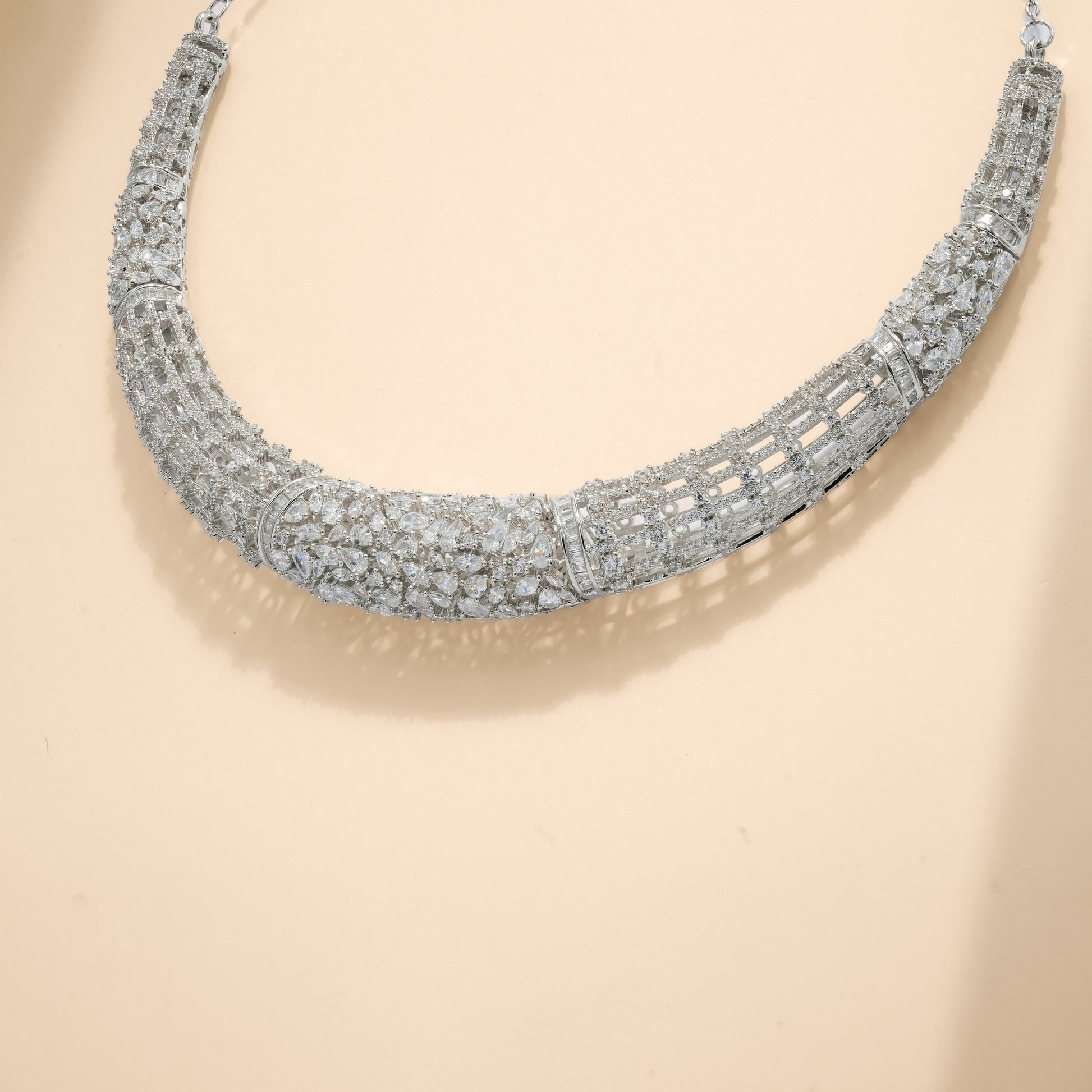 A sculptural necklace set defined by architectural layering and precise alignment. Crafted in real silver, the design balances structured geometry with refined brilliance, creating a statement that feels deliberate, composed, and confidently distinctive.