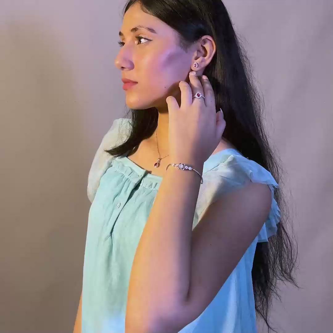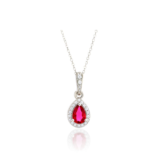 The Pendant features a vivid ruby-red stone wrapped in a delicate symbol.