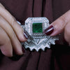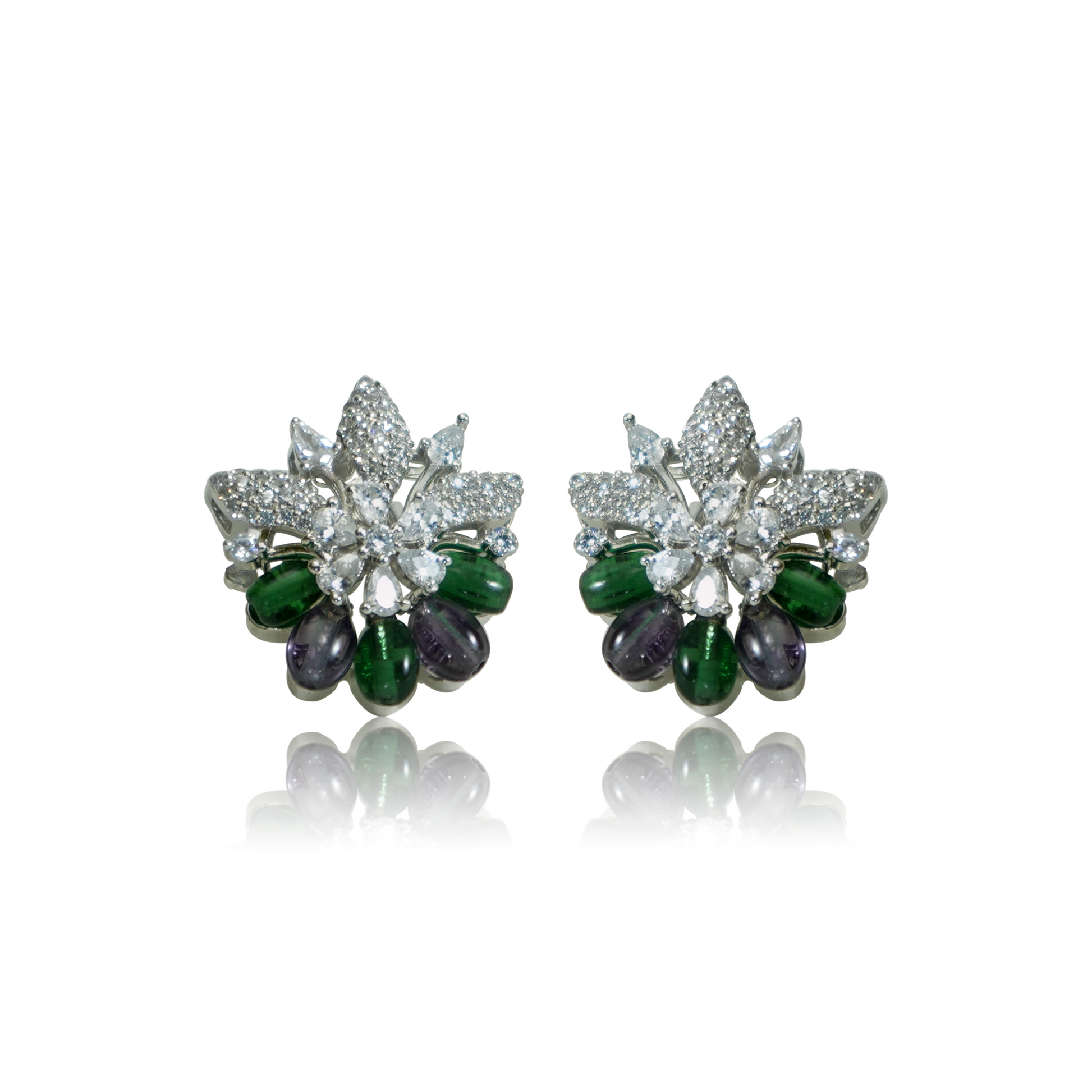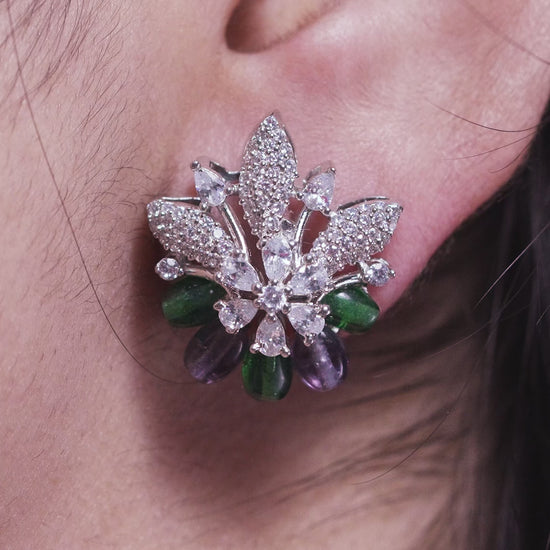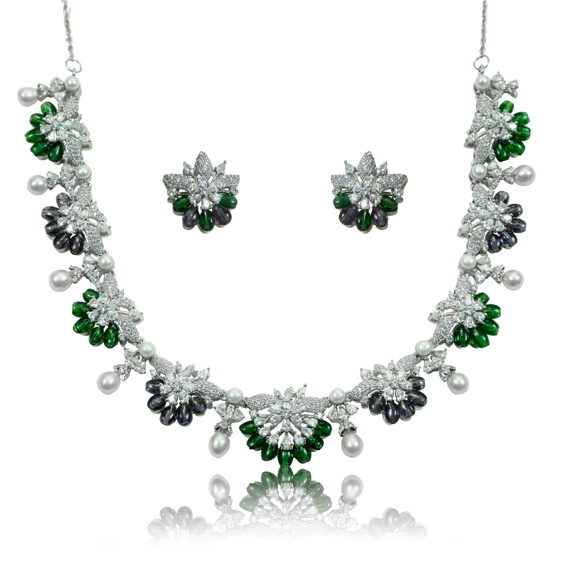 This necklace set features floral clusters crafted with green and grey stones, paired with pearl drops for added movement. The coordinated earrings mirror the same motif, creating a balanced and structured design ideal for festive and traditional looks.