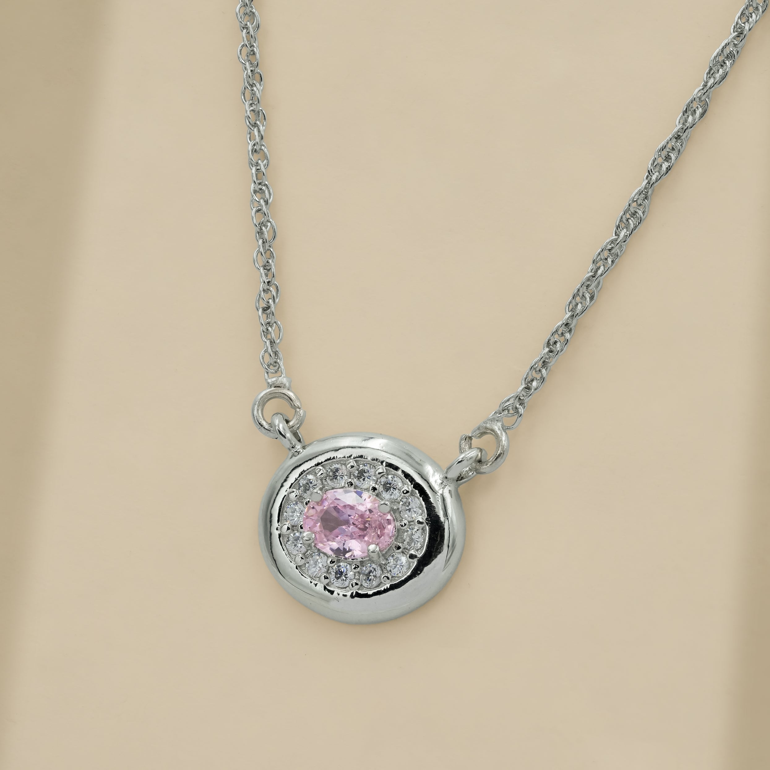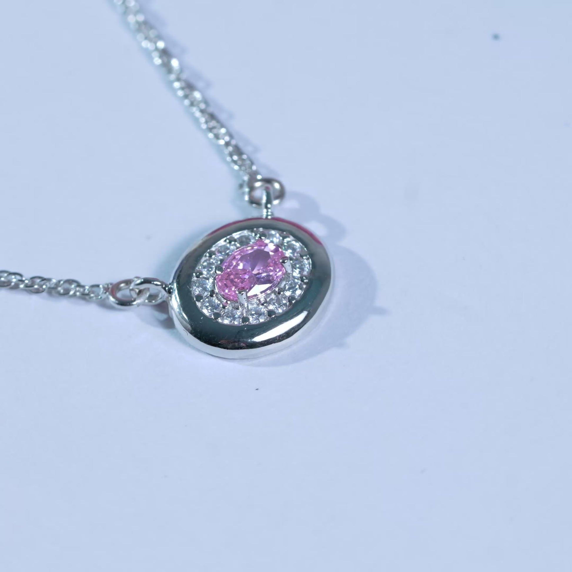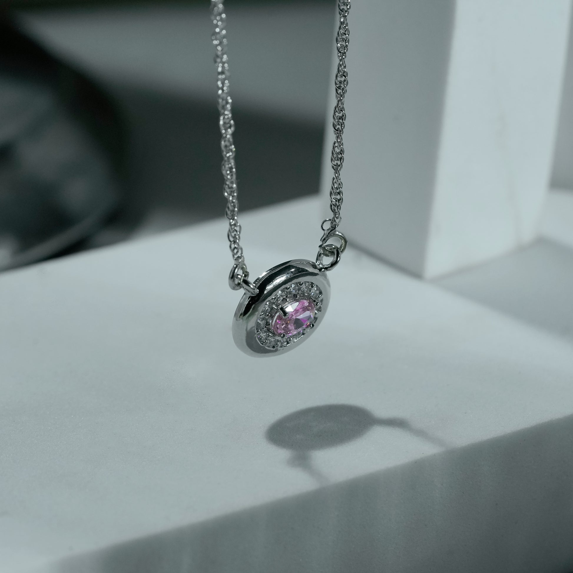 This necklace features a soft blush centerpiece framed by a refined circular silhouette, designed to sit gracefully at the neckline. The balanced proportions and smooth contours create a refined everyday statement, while the surrounding accents enhance depth and brilliance. Finished with a polished chain, this piece transitions seamlessly from daily wear to evening styling, offering a graceful expression of modern femininity with a subtle, romantic presence.