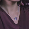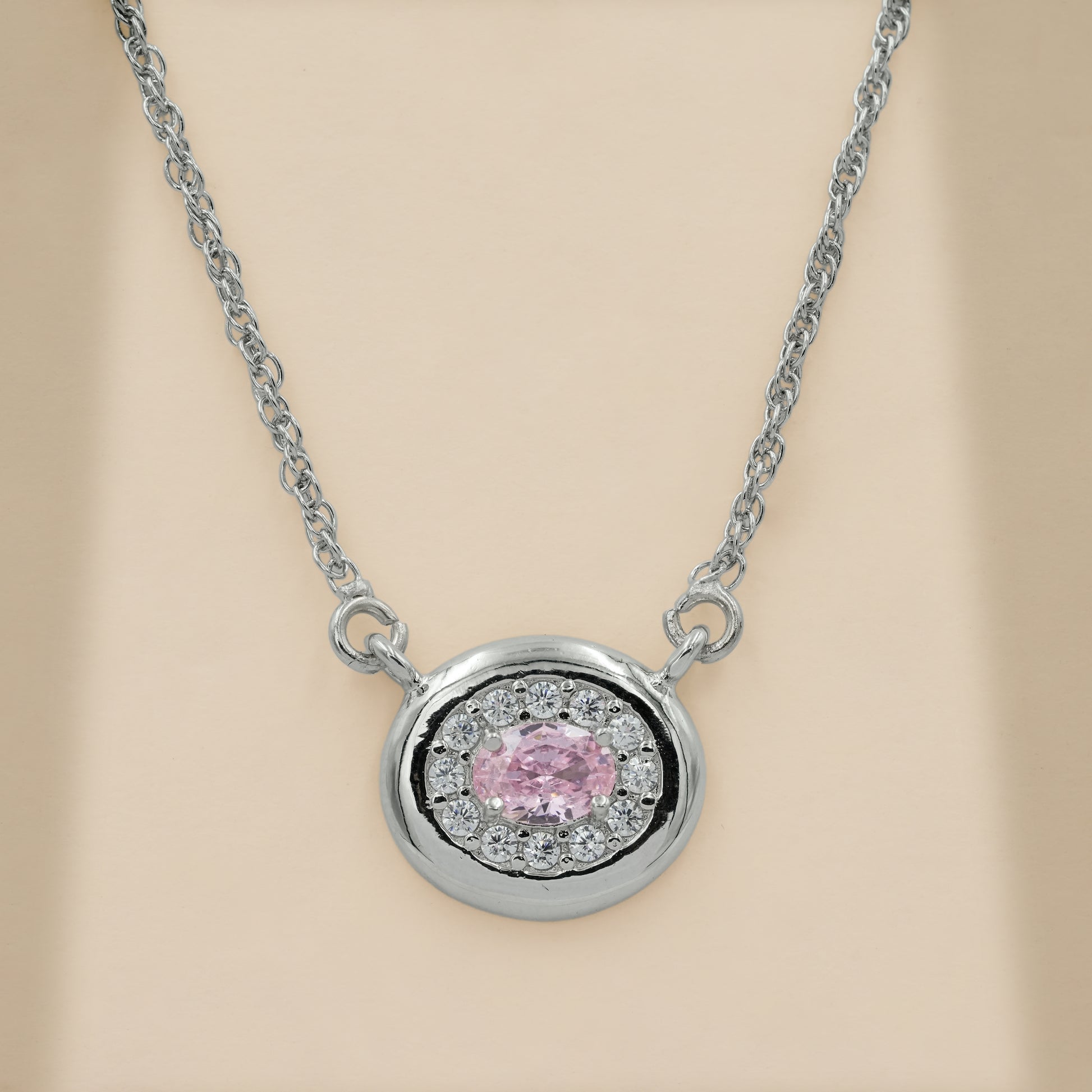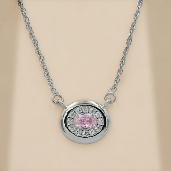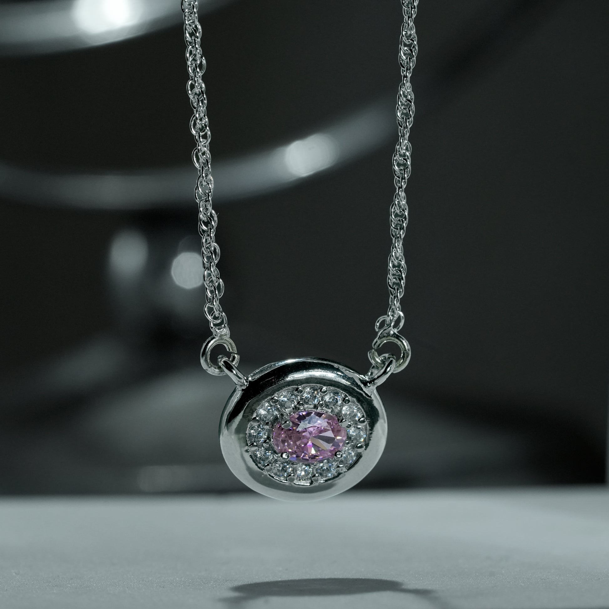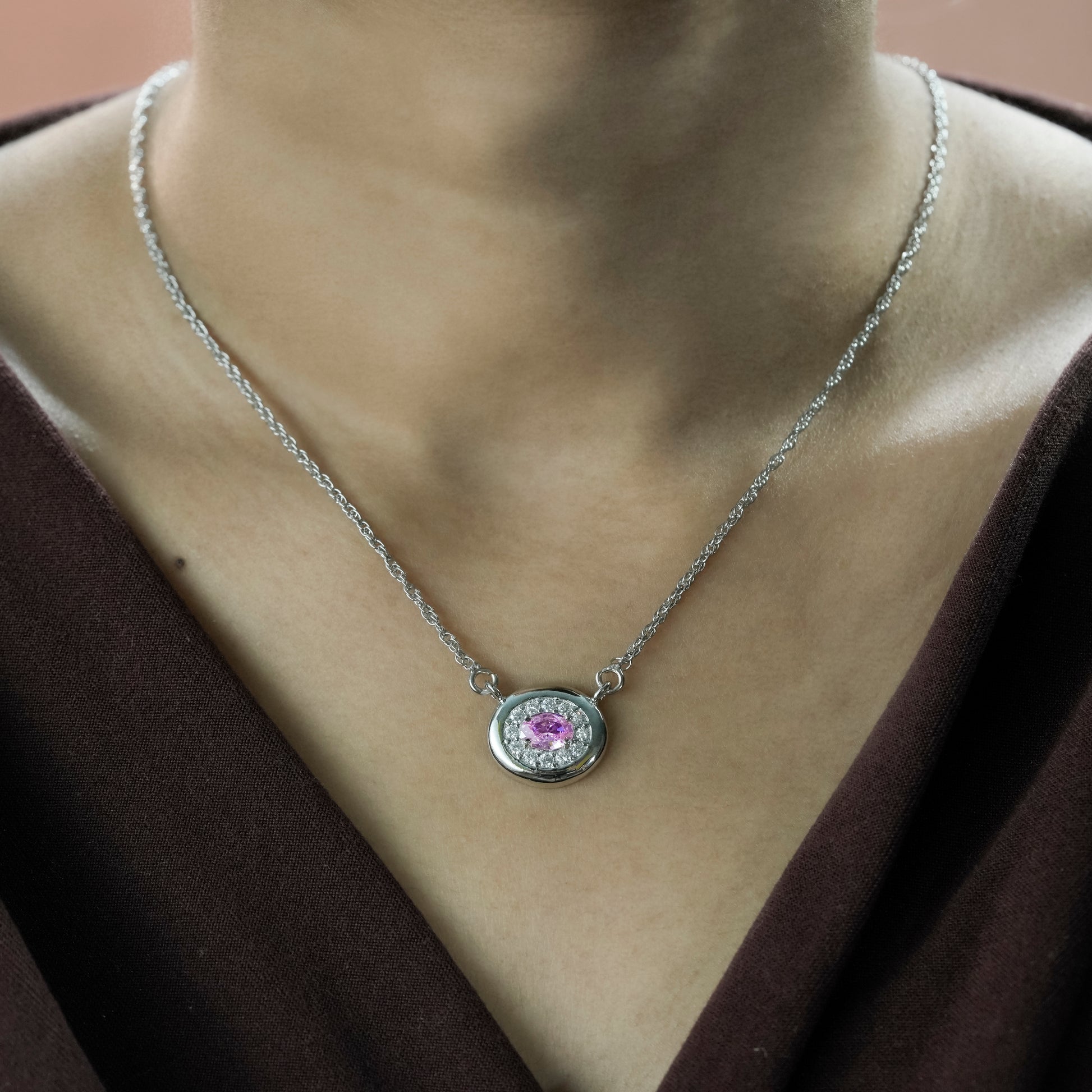 This necklace features a soft blush centerpiece framed by a refined circular silhouette, designed to sit gracefully at the neckline. The balanced proportions and smooth contours create a refined everyday statement, while the surrounding accents enhance depth and brilliance. Finished with a polished chain, this piece transitions seamlessly from daily wear to evening styling, offering a graceful expression of modern femininity with a subtle, romantic presence.