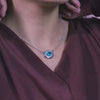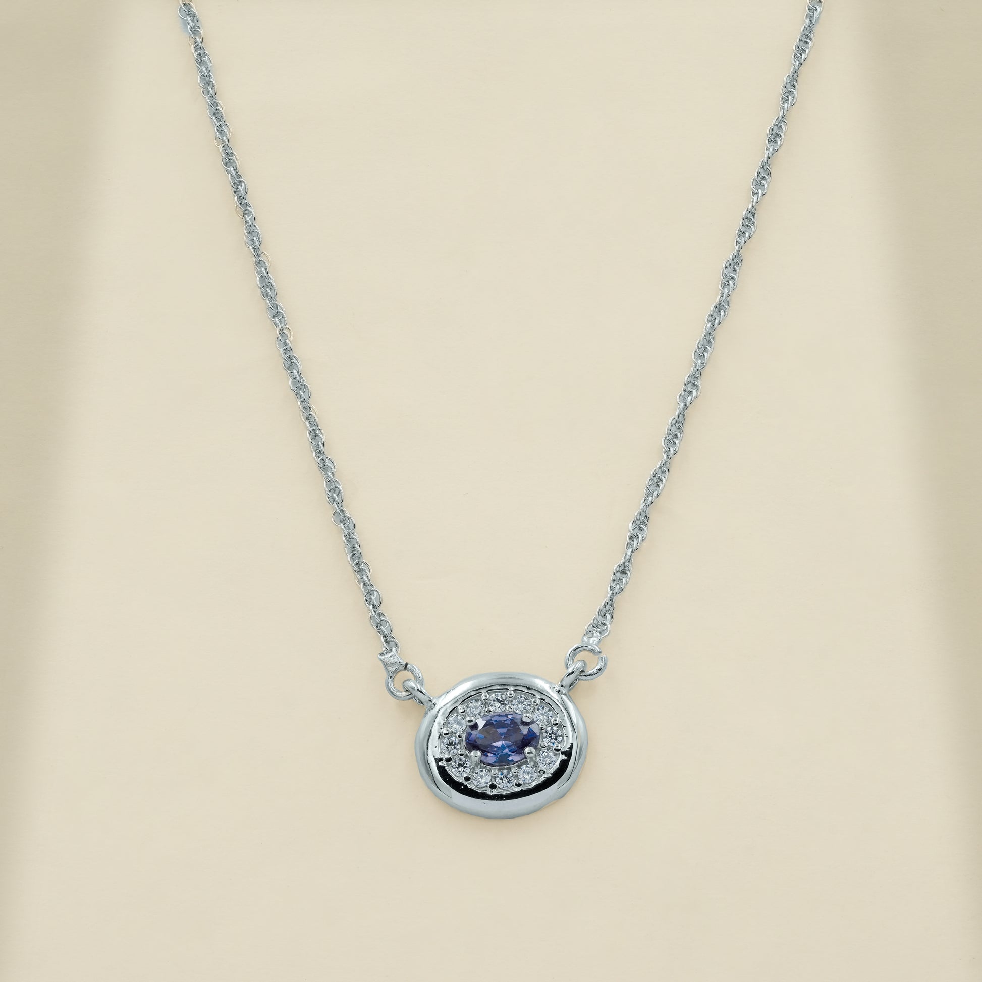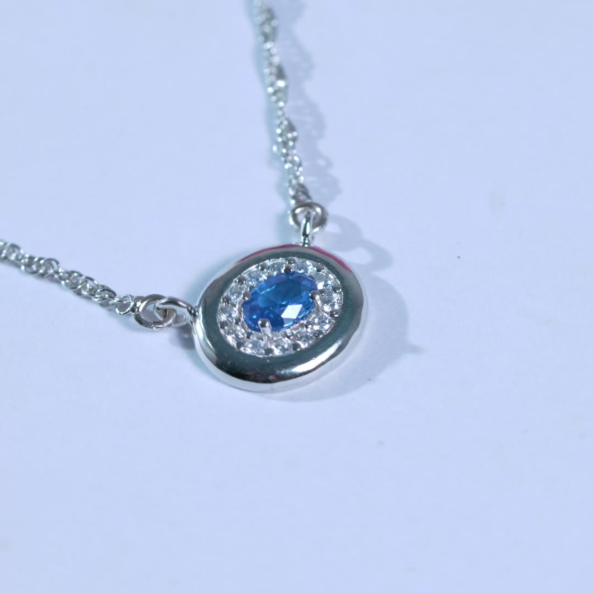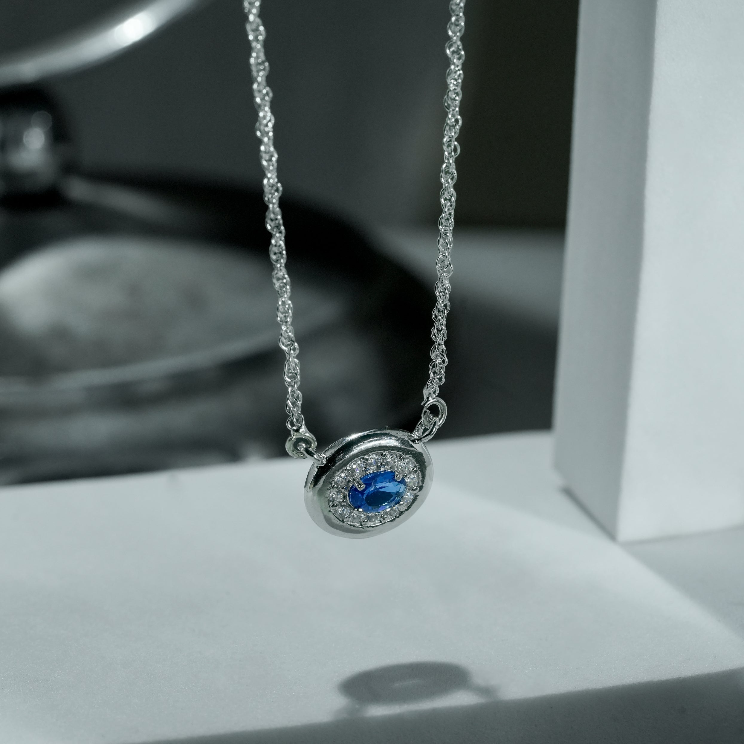 This necklace features a deep blue center accents framed by a precise halo of clear accents, set in sterling silver. The circular form creates a balanced, confident presence while the contrasting stones add depth and visual clarity. Designed for everyday wear as well as evening styling, it pairs clean geometry with refined craftsmanship, making it a versatile addition to modern jewelry collections.