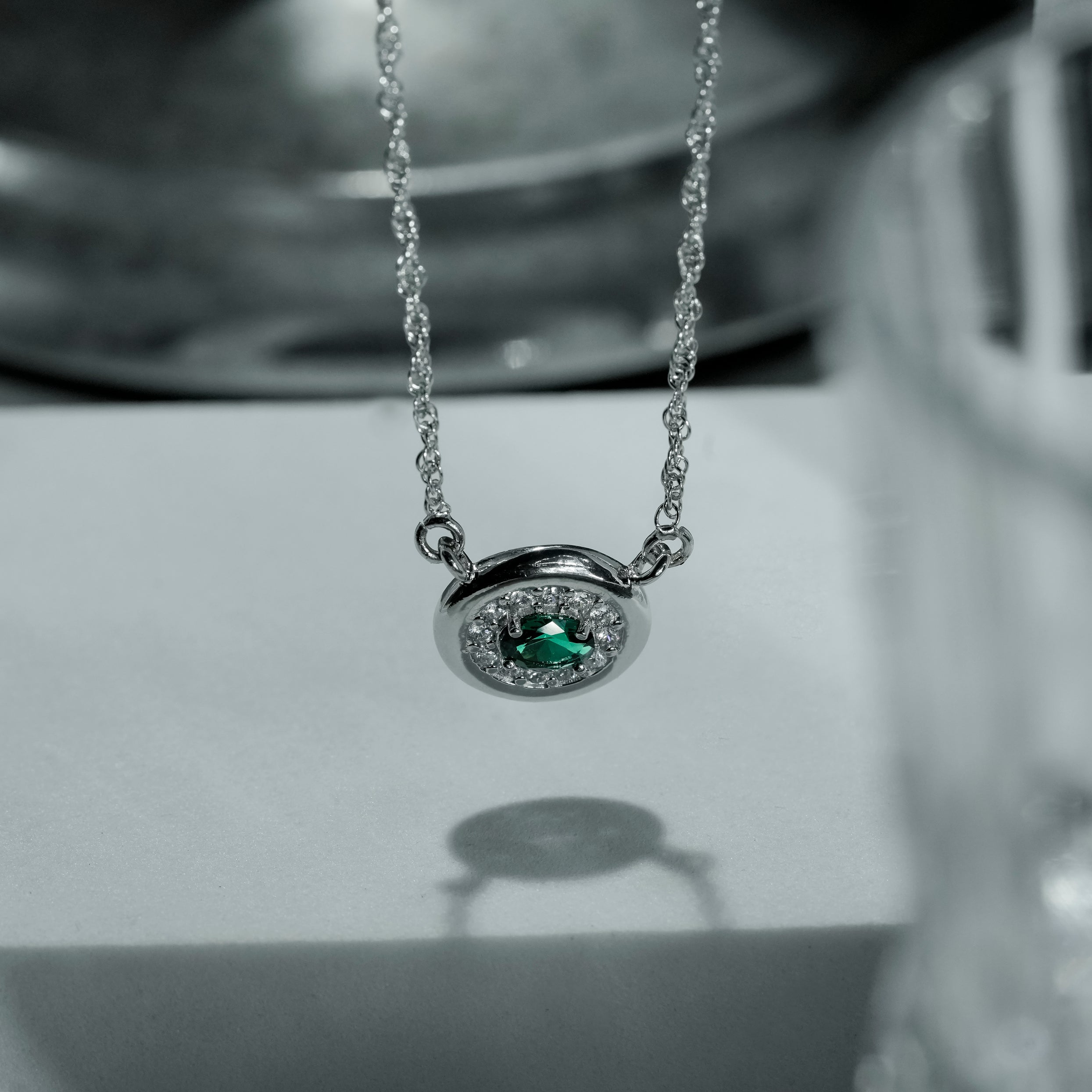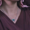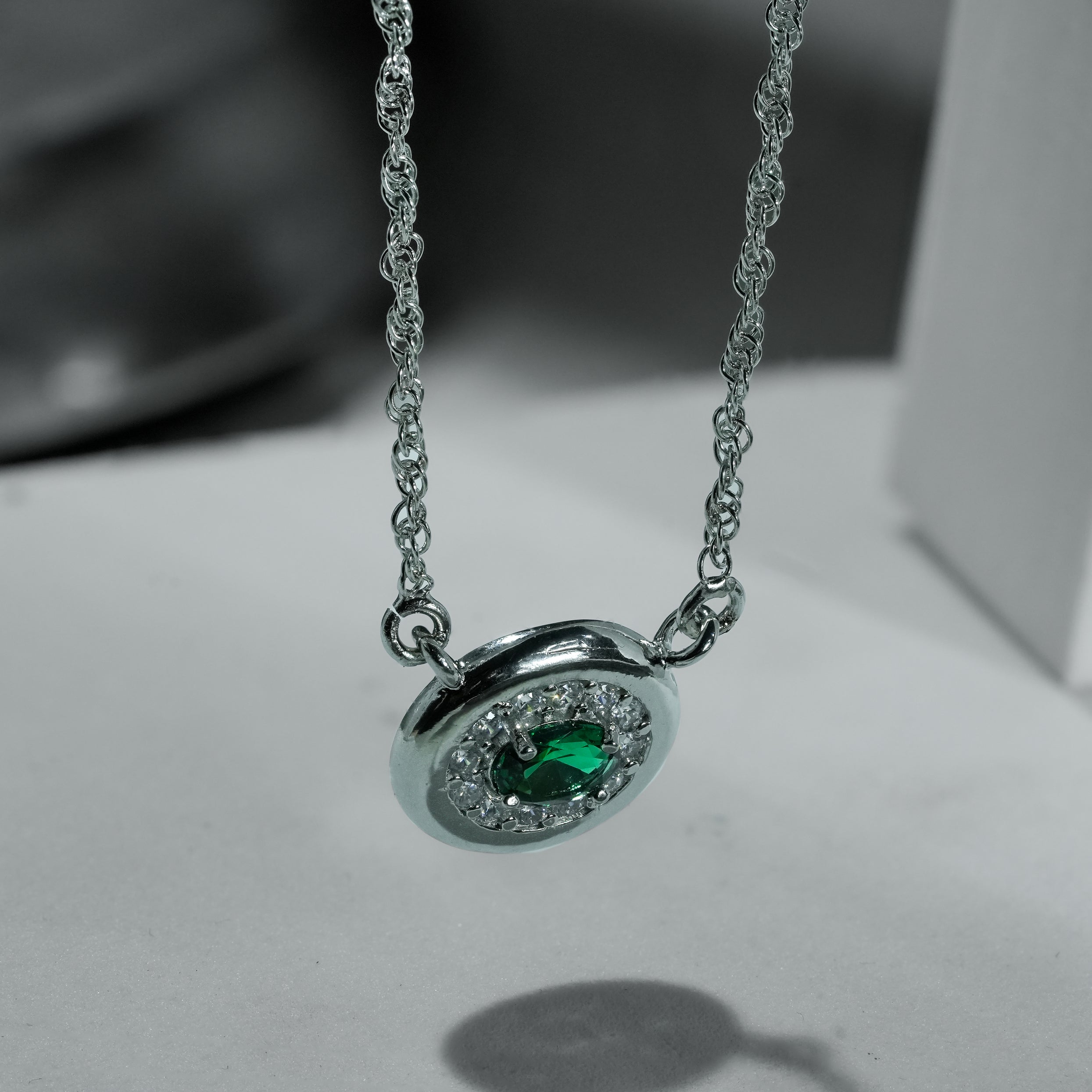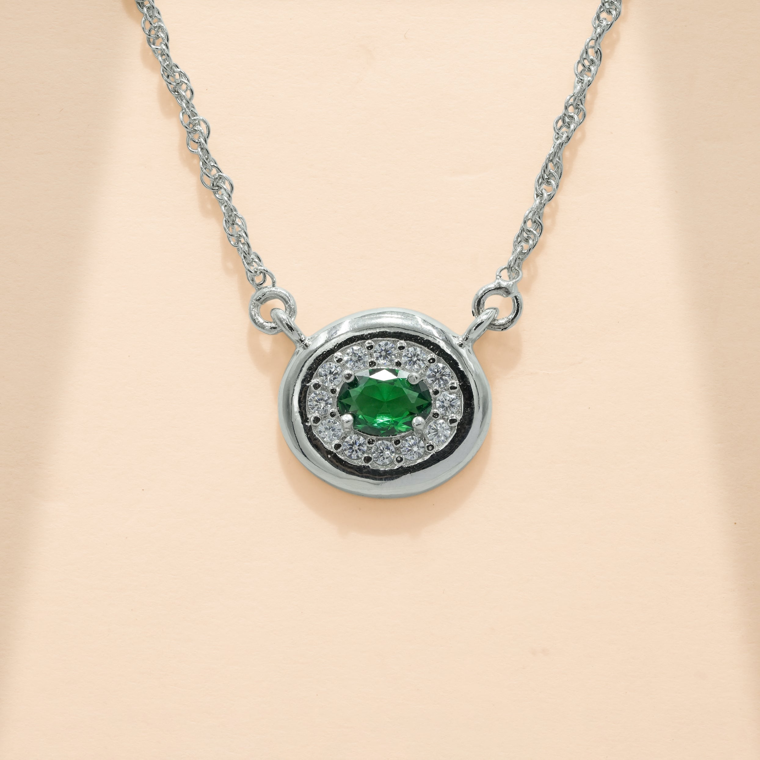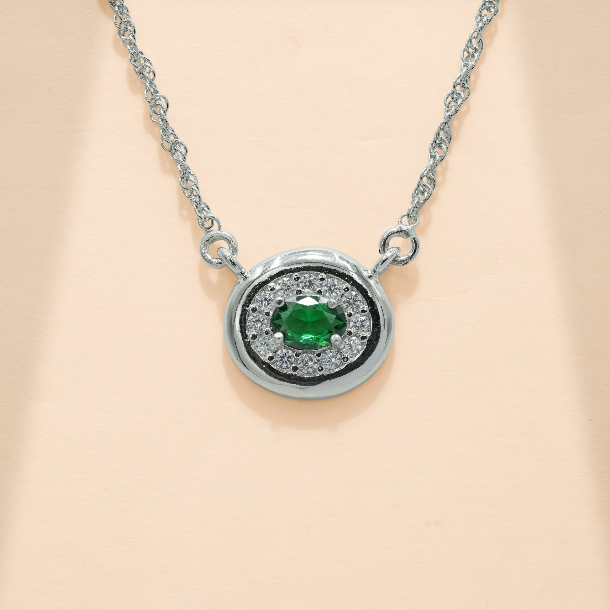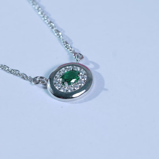 A refined necklace built around a vivid emerald-green centre, framed by a circular halo of finely set brilliance. The smooth sterling silver and balanced proportions give this piece a confident yet versatile presence. Suitable for everyday wear as well as evening styling, it delivers focused colour, clean geometry, and subtle shine without feeling heavy or overstated.