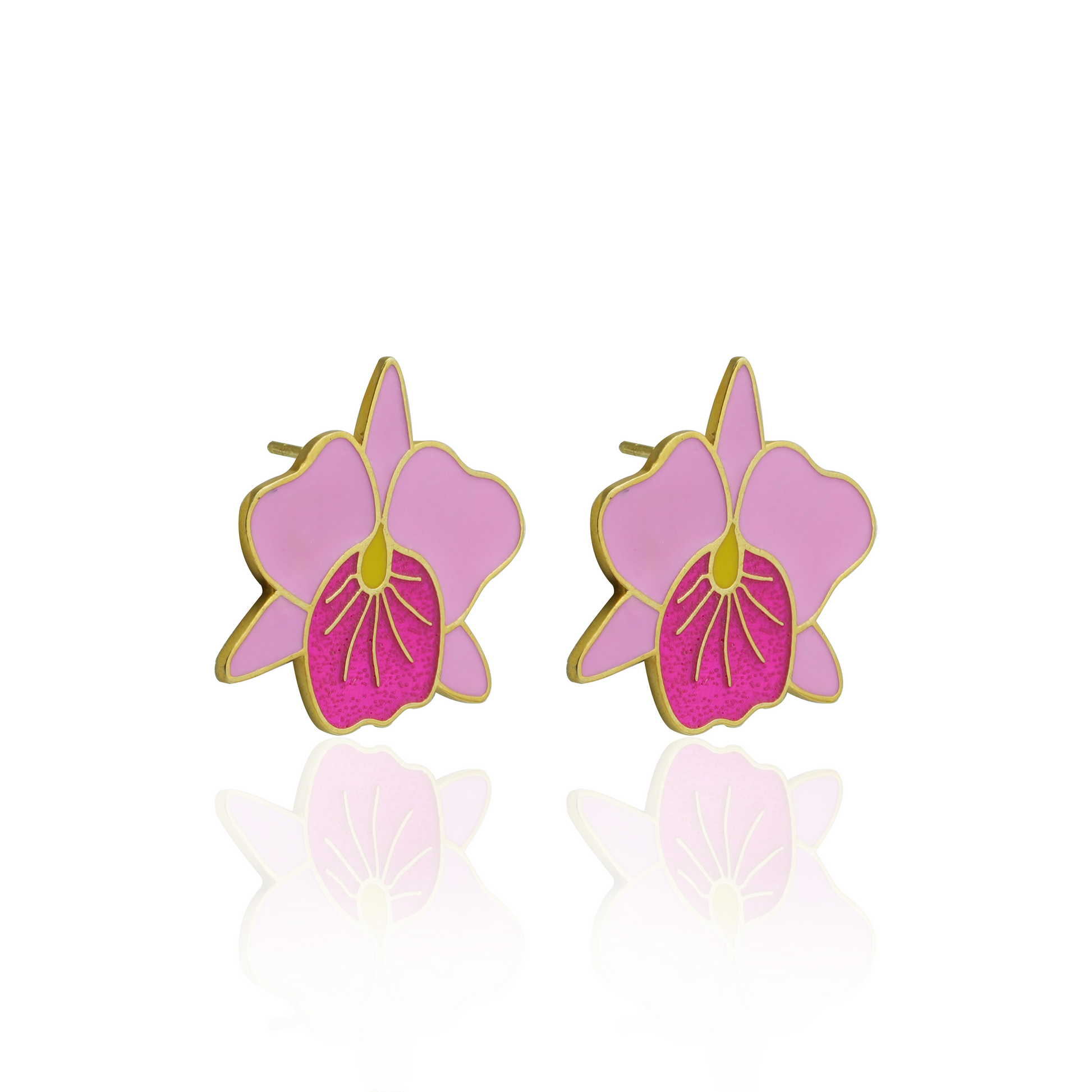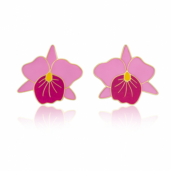 These orchid-inspired enamel earrings bring a burst of pink perfection to any look. Crafted with vibrant enamel detailing and a sleek gold-toned outline, they add a bold, feminine touch that stands out effortlessly. Perfect for playful everyday styling or statement occasions.
