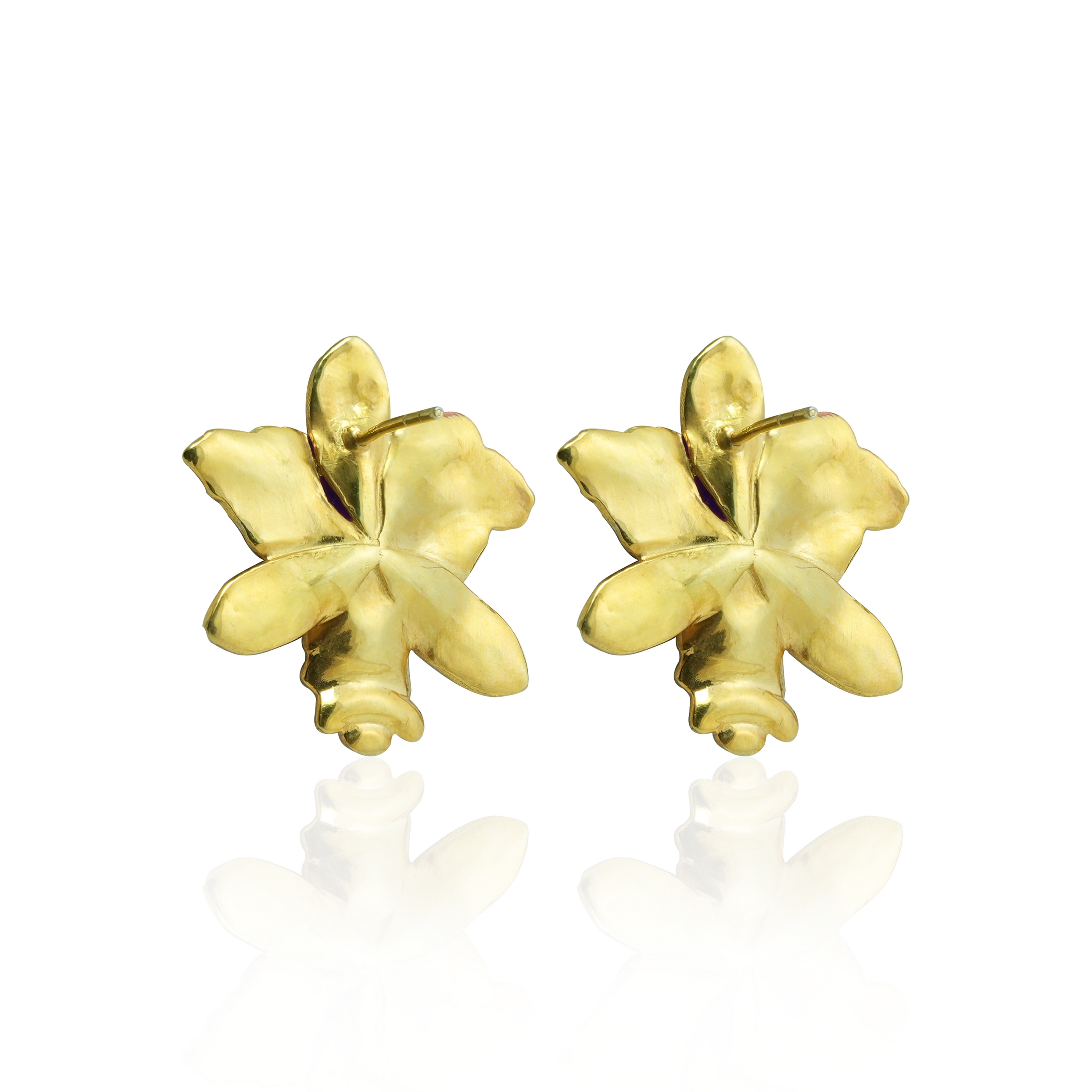 Bold, artistic, and impossible to ignore - these orchid-inspired enamel earrings feature deep violet petals with a contrasting green drop detail, finished in a luxe gold outline. A vibrant statement piece perfect for adding colour and personality to any look.